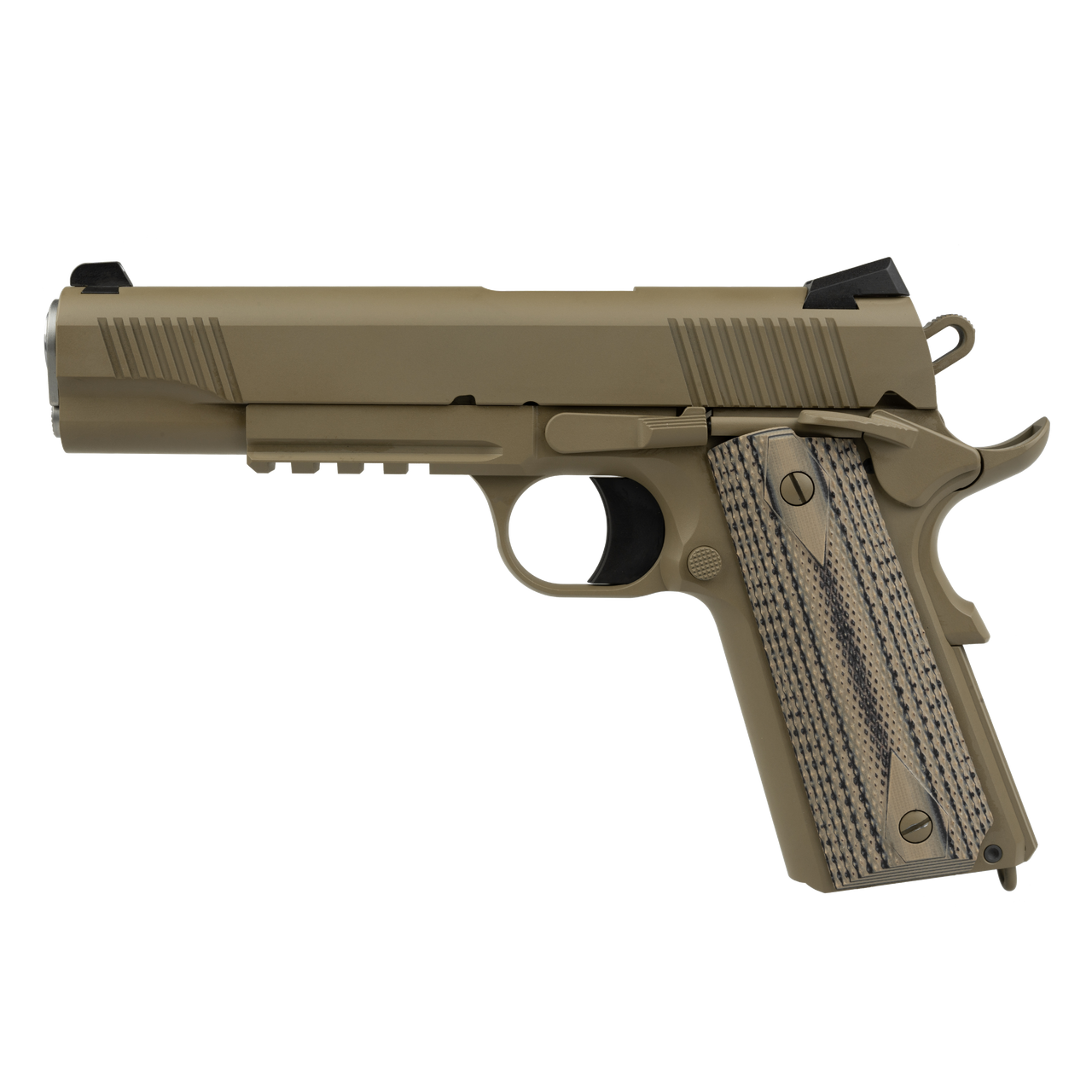 Tisas 1911 Duty pistol is a modernized version of the venerable 1911 pistol. The pistol features a hammer forged slide with front and rear slide serrations; hammer forged, steel full size frame; flared and lowered ejection port; skeletonized hammer and trigger; ambidextrous extended safety; 3 Dot Low Profile Sights, Novak Style Cut and Series 70 Internals. Includes two magazines, cleaning kit, owners manual, waterproof and lockable hard case w/fitted cut foam insert.