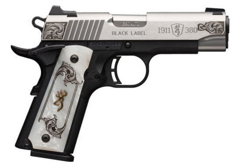 Browning 1911 380 ACP Medallion Compact Engraved 8 Rounds 4.25″ Barrel White Pearl SS/PRL Features: