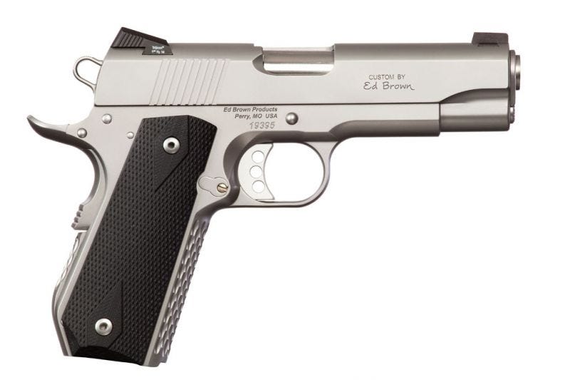 <p>The Alpha Carry has a 4.25″ Commander model slide with a single stack Commander Bobtail frame. The John Browning traditional design is innovatively modified for concealed carry, without significantly detracting from reliability or accuracy. This stainless steel pistol has a Chainlink I treatment on forestrap and mainspring housing for the ultimate in durability, secure grip, and extreme use. Ed Brown firearms are engineered, machined, and handcrafted for performance under the direct supervision of the Brown family. They strive to make the very best high grade, high performance firearms, at a reasonable price and delivery, using their own innovative designs, superior components, and old fashion hand craftsmanship all backed by a lifetime written warranty and excellent customer service. Ed Brown’s firearms manufacturing philosophy rests on three pillars, upon which they have built their 40 years of success. Ed Brown is engineered for performance, precision machined in America, and hand-crafted to perfection.</p>