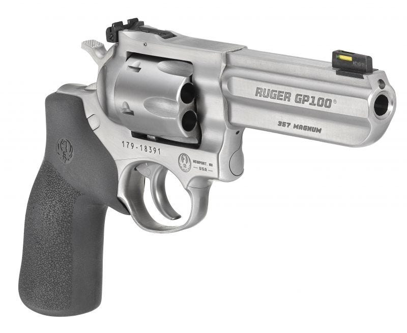 <p>GP100 Features Triple-locking contoured cylinder is locked into the frame at the front, rear and bottom for more positive alignment and dependable operation shot after shot and enables easy re-holstering. The ejector and chamber mouths have a light chamfer to aid loading. Grip frame design easily accommodates a wide variety of custom grips. Disassembly of integrated subassemblies requires no special tools and allows for easy maintenance and assembly. Transfer bar mechanism provides an unparalleled measure of security against accidental discharge. An adjustable rear sight and HiViz LiteWave(R) fiber optic front sight allows for a fast and visible sight picture. The 4.2″ barrel delivers lively handling for quick transition between targets and also features an 11 degree target crown for competitive-level accuracy. Polished and optimized internals, a centering boss on the trigger, and centering shims on the hammer produce a smooth double-action trigger pull and a crisp and consistent let-off. GP100 Specifications Manufacturer: Ruger Manufacturer Part #: 1786 Model: GP100 Model: TALO Action: Revolver Type: Double Action Caliber: 357 Magnum Barrel Length: 4.2″ Color: Silver Grips: Hogue Tamer Monogrip Capacity: 6Rd Sights: Adjustable Sights Material: Stainless Steel Finish: Satin</p>