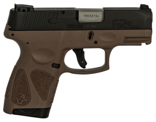 This G2S model has a brown frame with a matte black carbon steel slide. It includes two 7-round magazines.