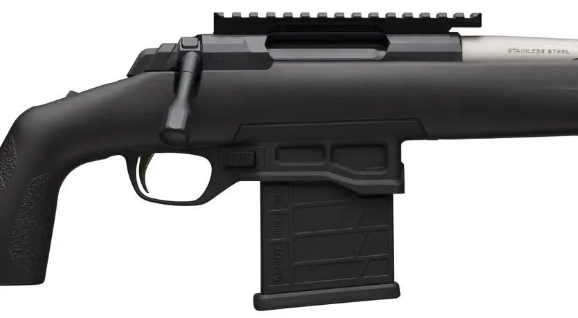 New in 2023 — A new Browning bolt action rifle optimized for long range target shooting and competition. Features include a stiffer, heavier receiver, fluted stainless steel sporter weight barrel with Recoil Hawg muzzle brake on 5/8″ 24 suppressor ready threads, adjustable Target DLX trigger, extended bolt handle and adjustable MAX composite stock.